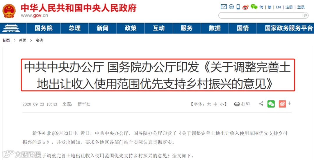 9月23日,中办、国办印发《关于调整完善土地出让收入使用范围优先支持乡村振兴的意见》。