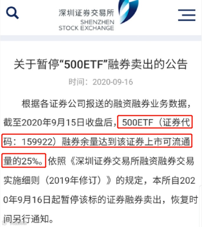 虽然不知道其消息内容的真实性,但从9月16日,深交所官网发布的《关于暂停“500ETF”融券卖出的公告》可以看出些许端倪。