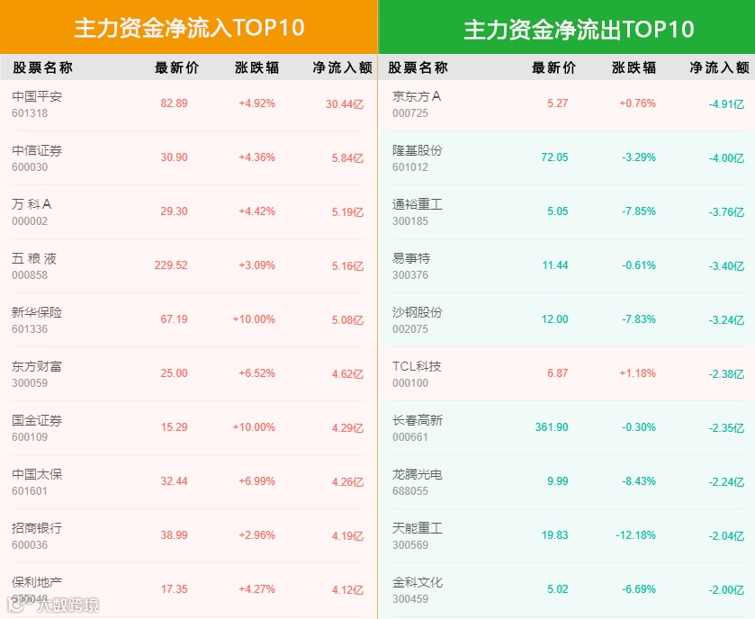 净流入额分别为65.54亿、15.87亿、15.05亿、13.85亿、12.22亿。主力资金净流出前5的个股是