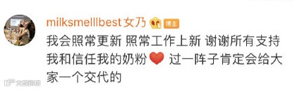 张大奕也在社交平台小号评论区回应了近期的传闻,称:“我会照常更新,照常工作上新,谢谢所有支持我和信任我的奶粉,过一阵子肯定会给大家一个交代的。”