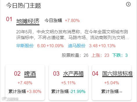 具体来看,今日指数小幅高开,开盘之后指数震荡下行,【地摊经济】继续火爆,啤酒板块跟随上涨,券商板块也有活跃表现,而光刻胶板块则跌幅居前。