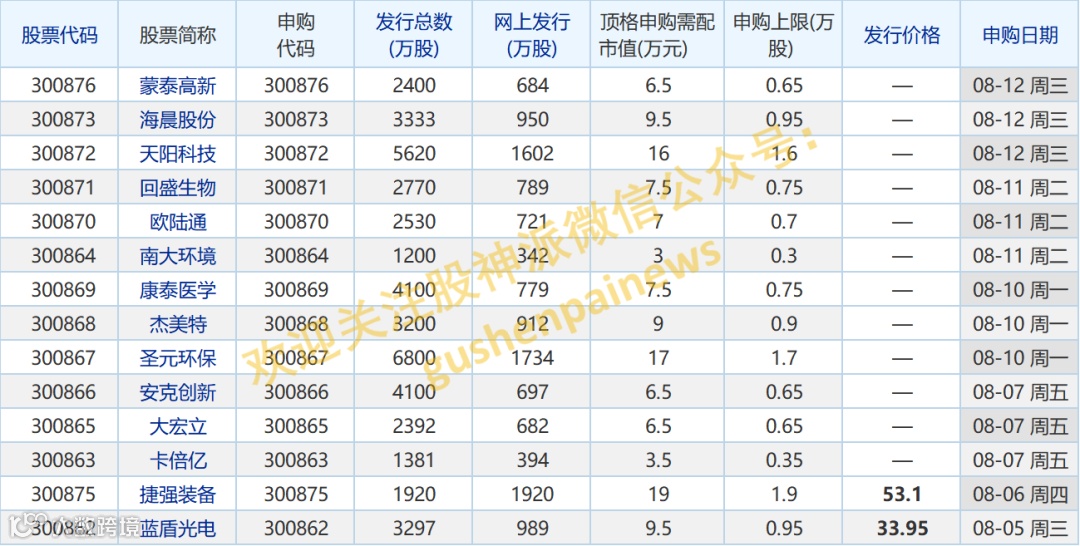 除了锋尚文化、美畅股份两只个股外,创业板注册制下,批量新股迎来打新。这也为投资者送上一场打新盛宴。按照时间表,接下来还有蓝盾光电、卡倍亿、大宏立、安克创新四只创业板新股进行申购,申购日分别为8月5日、7日。其中,蓝盾光电在8月5日申购,剩余三只新股的打新日期为8月7日。