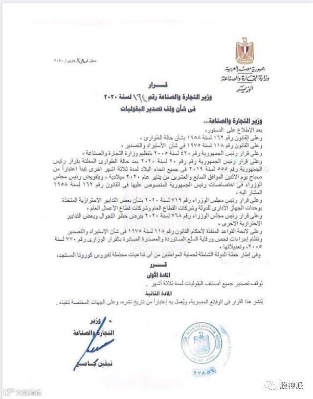 埃及贸易和工业部长内文·贾梅决定,自当日起未来3个月内停止各种豆类产品的出口
