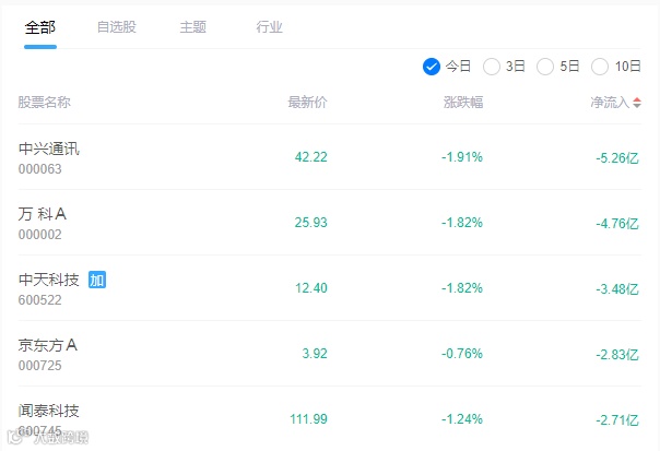 主力资金净流出前5的个股是中兴通讯,万 科A,中天科技,京东方A,闻泰科技,净流出额分别为5.26亿、4.76亿、3.48亿、2.83亿、2.71亿。