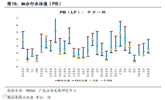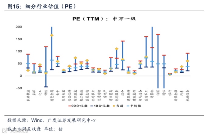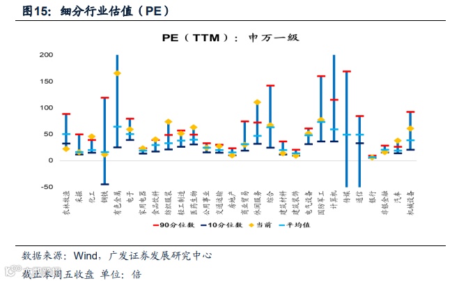 来看,申万一级行业中,有色金属、电子、家用电器、轻工制造、交 通运输、国防军工、机械设备等行业估值高于历史均值。其中,化工、食品饮料、 纺织服装、医药生物、休闲服务、计算机、汽车行业估值高于历史