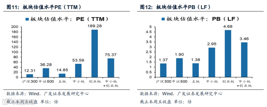 创业板的PE(TTM)为189.28倍,PB(LF)为4.68倍;主板的PE(TTM)为14.85倍、PB(LF)为1.38倍。