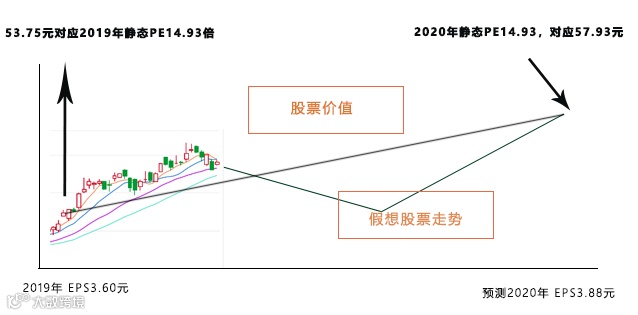 但我们想一想,假如我们有一台时光机,可以穿越未来,到了2020年4月份,发现2020年年报果然是3.88元,那意味着,如果大盘还是这个点位,还是这个估值水平,市场上大部分人都愿意以14.93倍的PE买入,即57.93元。