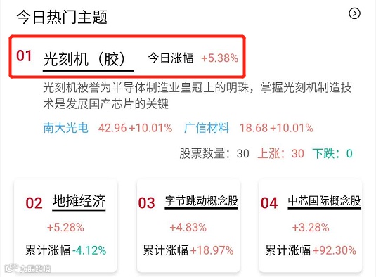24小时数据实时监控,智能分析当前热门板块的小助手。根据当日热点主题,精准找到市场热点为板块为光刻机(胶)、地摊经济、字节跳动等概念股。