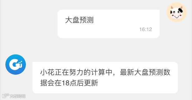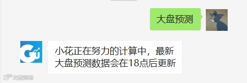 再或者,你想知道下一个交易日大盘的涨跌情况,在对话框输入:大盘预测 即可,当然得等到数据更新之后。