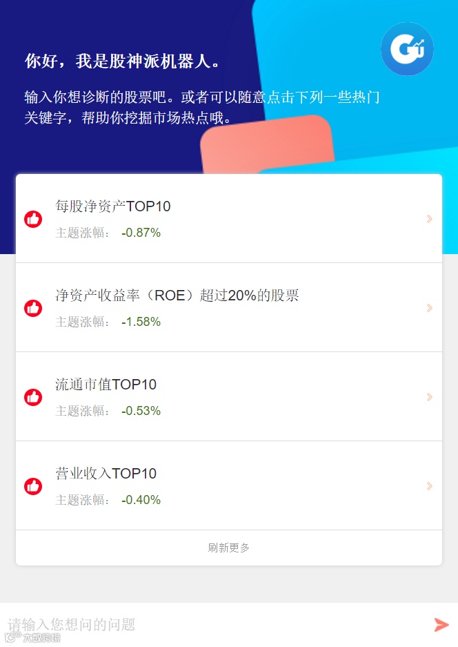 股神派机器人是一个专业诊股的小能手,股神派炒股小助手功能:实时查询股票信息,分析股票走势强弱,各大财经快讯推送、预测大盘涨跌、实时监控大盘涨跌,汇总各大主题涨幅。