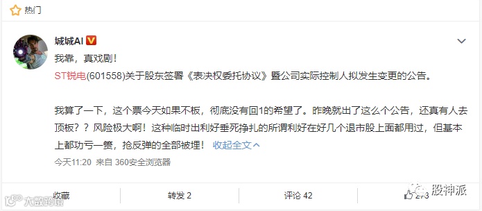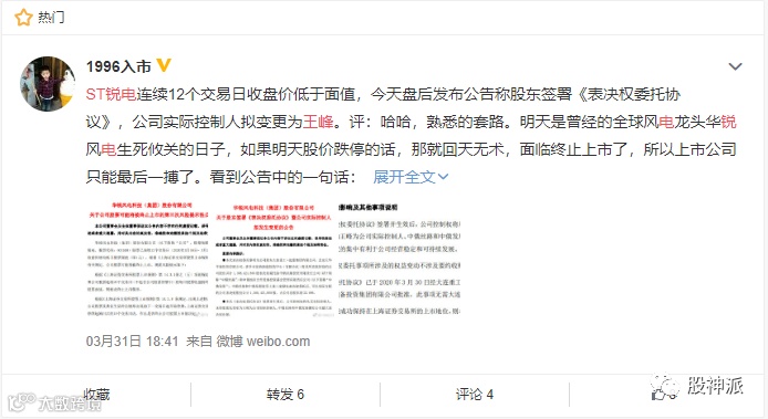 今天,有网友在微博上吐槽:“我算了一下,这个票今天如果不板,彻底没有回1的希望了。昨晚就出了这么个公告,还真有人去顶板??风险极大啊!这种临时出利好垂死挣扎的所谓利好在好几个退市股上面都用过,但基本上都功亏一篑,抢反弹的全部被埋! ”