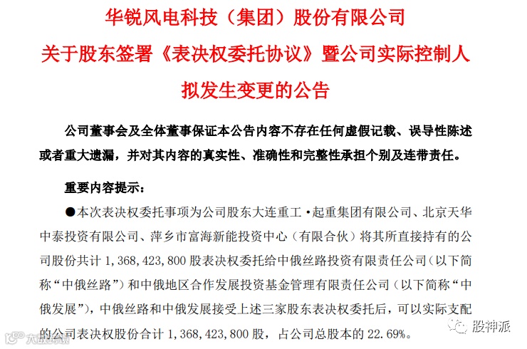 昨晚,ST锐电发布公告称,公司的三家股东大连重工·起重集团、北京天华中泰投资萍乡市富海新能投资中心(有限合伙)与中俄丝路投资、中俄地区合作发展基金签署了《表决权委托协议》,将13.68亿股表决权委托给后两者,合计占比22.69%。