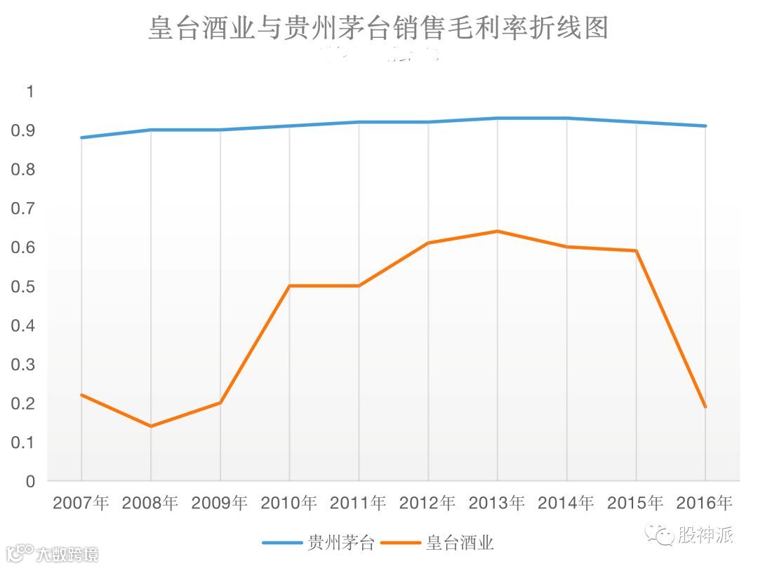 2000年,皇台酒业上市,而贵州茅台在次年才完成上市。遗憾的是,由于经营不善,皇台酒业逐渐被茅台远远地甩在身后,其近年来的销售毛利率更是与茅台难以相提并论。