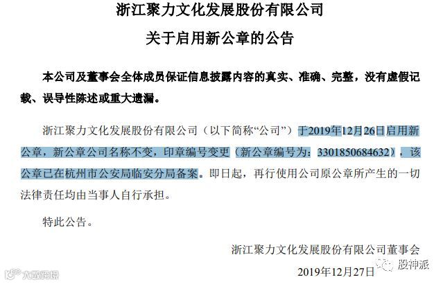 目前,聚力文化反复强调公司的正常运营已受到严重影响。而从公告中透露的种种信息来看,这似乎又是一场因董事长更迭引起的“宫斗剧”。截至12月26日,公司已经启用了新公章,新公章公司名称不变。