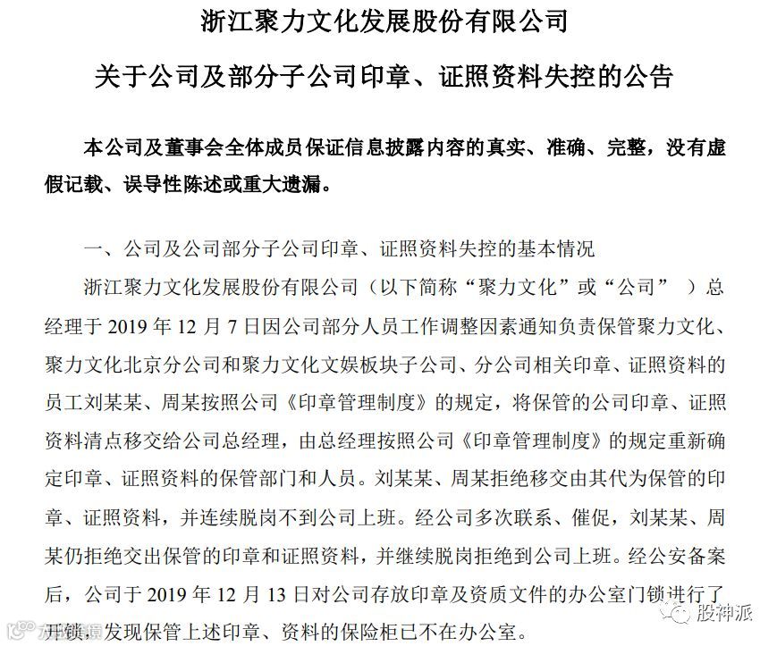 12月23日晚间,聚力文化公告称,公司总经理已于12月7日通知相关员工,清点移交其负责保管的公司及部分子公司印章、证照资料,但却遭到了这两位员工的多次拒绝。