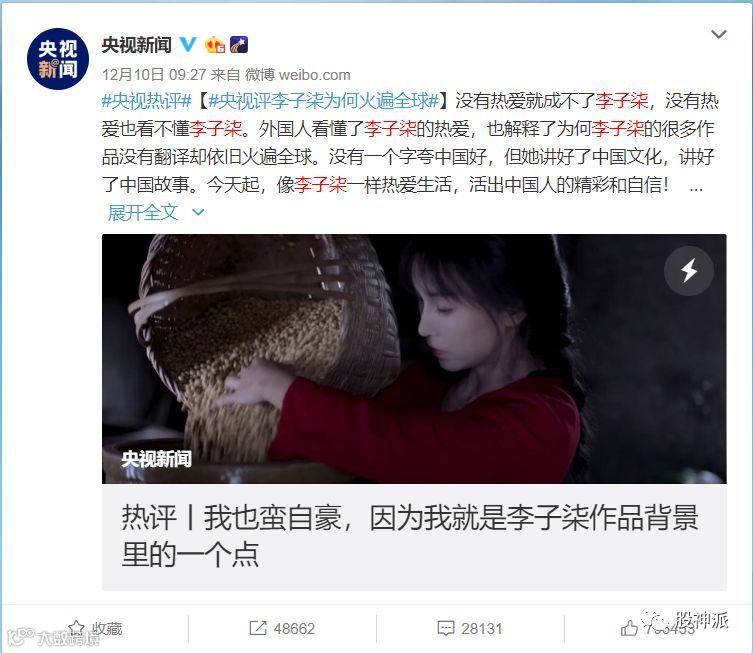 在12月9日人民日报、光明日报、共青团中央点赞推荐李子柒、12月10日央视新闻发表关于李子柒的评论文章后,各大媒体迅速跟进传播,背后的A股关联公司星期六直接被引爆了。