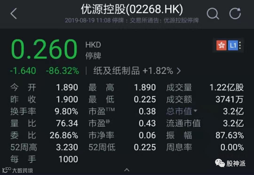 8月19日,港股公司优源控股(02268.HK)在早盘交易时段突然盘中放量闪崩,在不到20分钟内最低一度跌至0.225港元,引发公司紧急停牌,停牌时股价报0.26港元,暴跌86.32%,换手率9.8%,目前公司市值仅为3.232亿港元,半小时的暴跌致使公司市值蒸发了逾20亿港元。