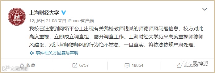 当天晚间,上海财经大学官方微博发布声明,称对于网上出现有关钱某的师德师风问题信息,已成立调查组,展开调查工作,“一旦查实,将依法依规严肃处理”。