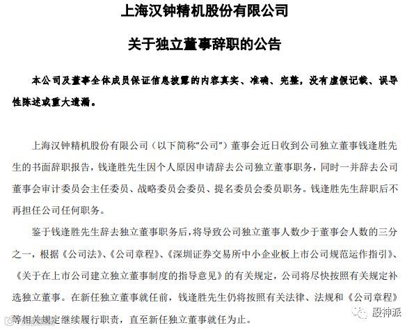 12月8日晚间,东富龙、汉钟精机两家A股上市公司同时发布公告称,独立董事钱逢胜因个人原因申请辞去两家公司独立董事职务,且不再担任两家公司任何职务。