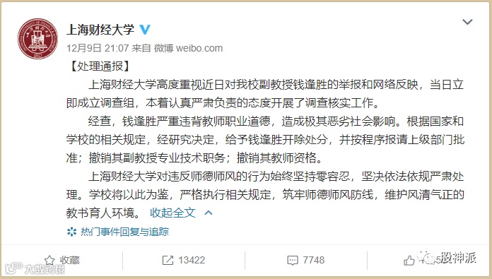 12月9日晚间,据@上海财经大学官方微博,上海财经大学正式通报:经查,钱逢胜严重违背教师职业道德,造成极其恶劣社会影响。根据国家和学校的相关规定,经研究决定,给予钱逢胜开除处分,并按程序报请上级部门批准;撤销其副教授专业技术职务;撤销其教师资格。