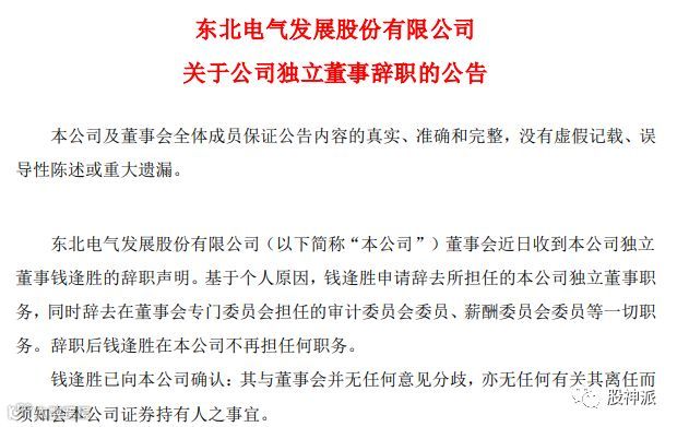 12月9日晚间,ST东电再发公告,基于个人原因,钱逢胜申请辞去所担任的公司独立董事职务,同时辞去在董事会专门委员会担任的审计委员会委员、薪酬委员会委员等一切职务。辞职后,钱逢胜在公司不再担任何职务。