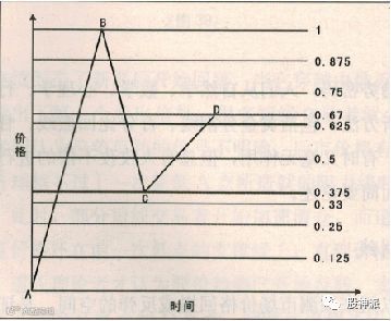 对于股价回撤时停留的位置,大致会有10个,它们分别是:1/8=12.5%处,2/8=25%处,1/3=33%处,3/8=37.5%处,4/8=50%处,5/8=62.5%处,2/3=67%处,6/8=75%处,7/8=87.5%处,8/8=100%处(该图将百分比都换成了数字)。
