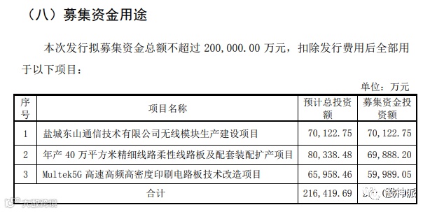 10月18日,东山精密推出拟募资20亿元的定增预案,投向“盐城东山无线模块生产建设项目”、“年产40万平方米精细线路柔性线路板及配套装配扩产项目”和“Multek5G高速高频高密度印刷电路板技术改造项目”。