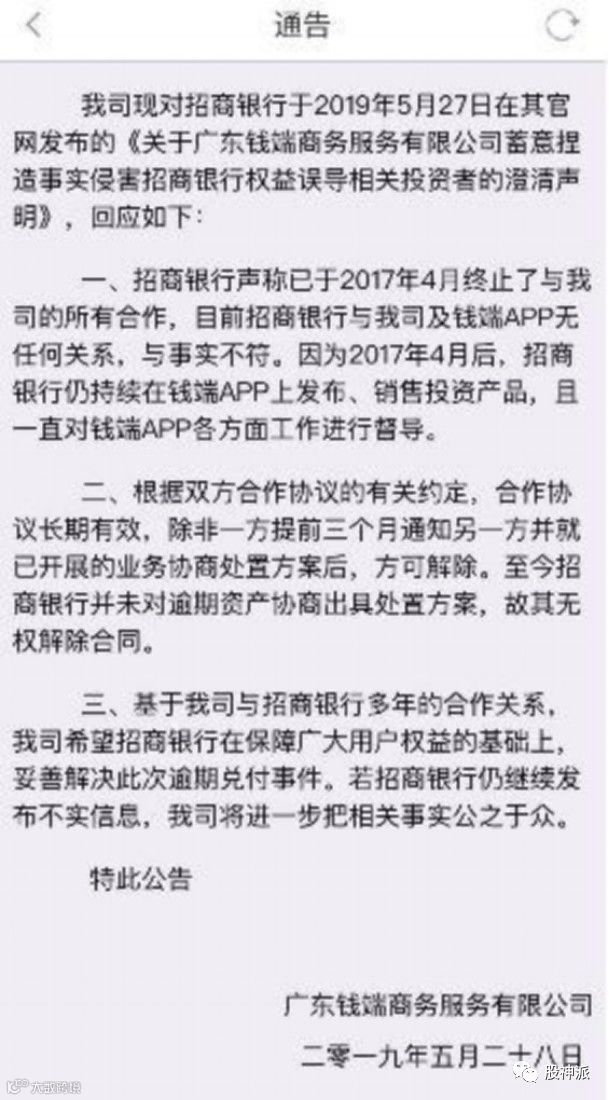 而到了钱端这一边,公司宣布所售产品逾期时,顺手把锅甩给了招商银行。在它的公告中称,逾期一事与招商银行直接相关。然而很快,在钱端的APP上就找不到这则通告了。