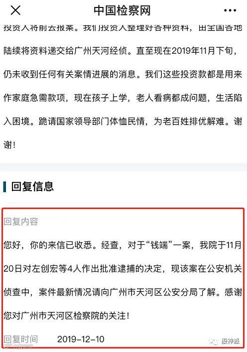 12月11日,又出了新的消,广州市天河区检察院于中国检察网回复钱端投资人称,已于11月20日对左创宏等4人作出批准逮捕的决定。