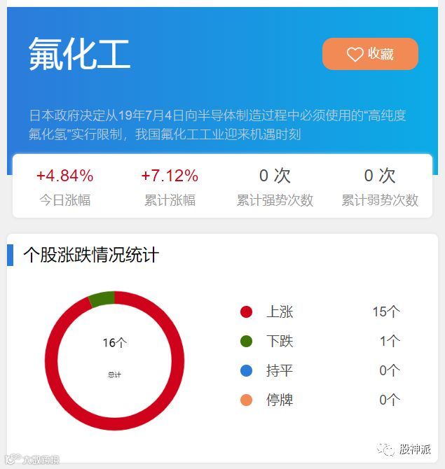 2019年7月4日,根据股神派智能大数据显示,日本政府决定从向半导体制造过程中必须使用的“高纯度氟化氢”实行限制,我国氟化工工业迎来机遇时刻。
