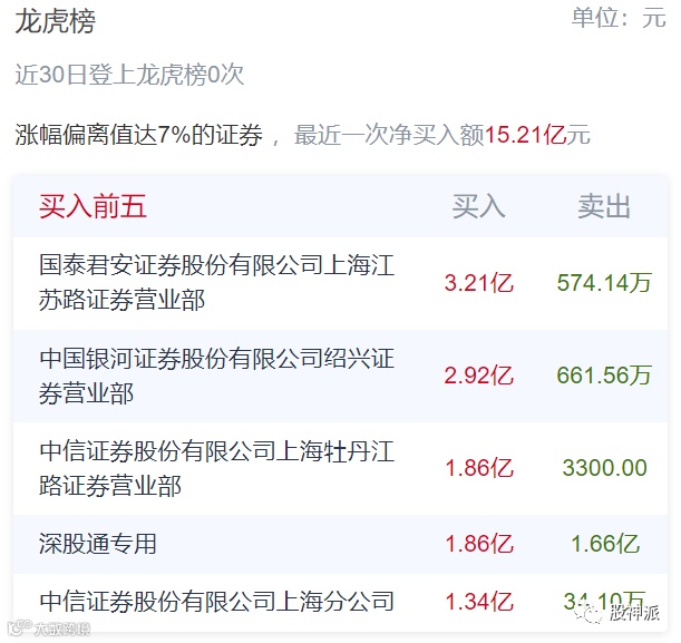 4月16日中兴通讯的龙虎榜情况显示,国泰君安证券上海江苏路证券营业部当天买入了3.21亿元,中国银河证券绍兴证券营业部也买入了2.92亿元。