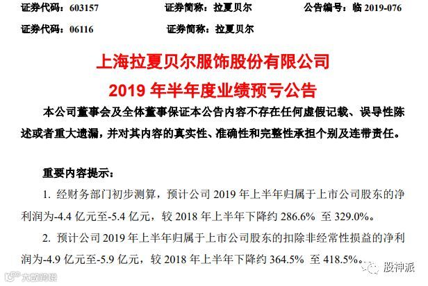 7月30日晚间,拉夏贝尔公布了半年度业绩预亏公告,公告中,拉夏贝尔预计上半年净利润亏损4.4亿元至5.4亿元,而上年同期盈利2.36亿元。