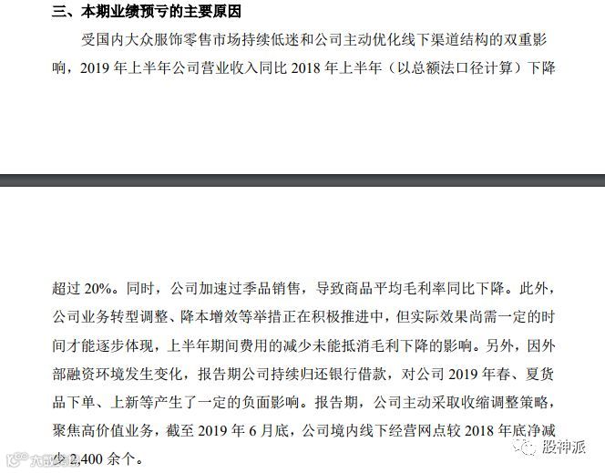 业绩预告显示,今年上半年,公司境内线下门店较2018年末净减少2400多个。公司表示,这是根据市场形势主动采取的收缩策略,以聚焦高价值业务。