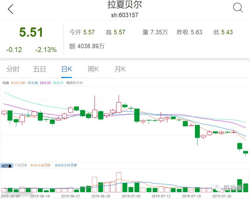 此前IPO上市时,拉夏贝尔发行价为8.41元。截至8月1日收盘,拉夏贝尔每股报5.51元,下跌2.13%。