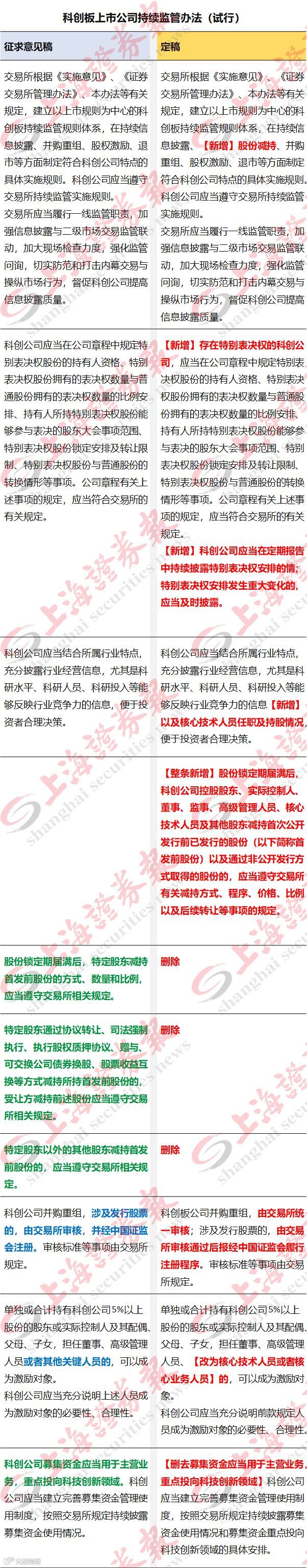 修改完善后的《持续监管办法》共9章36条。主要有以下内容:一是明确适用原则。科创板上市公司(以下简称科创公司)应适用上市公司持续监管的一般规定,《持续监管办法》与证监会其他相关规定不一致的,适用《持续监管办法》。二是明确科创公司的公司治理相关要求,尤其是存在特别表决权股份的科创公司的章程规定和信息披露。三是建立具有针对性的信息披露制度,强化行业信息和经营风险的披露,提升信息披露制度的弹性和包容度。四是制定宽严结合的股份减持制度。适当延长上市时未盈利企业有关股东的股份锁定期,适当延长核心技术团队的股份锁定期;授权上交所对股东减持的方式、程序、价格、比例及后续转让等事项予以细化。五是完善重大资产重组制度。科创公司并购重组由上交所审核,涉及发行股票的,实施注册制;规定重大资产重组标的公司须符合科创板对行业、技术的要求,并与现有主业具备协同效应。六是股权激励制度。增加了可以成为激励对象的人员范围,放宽限制性股票的价格限制等。七是建立严格的退市制度。根据科创板特点,优化完善财务类、交易类、规范类等退市标准,取消暂停上市、恢复上市和重新上市环节。此外,《持续监管办法》还对分拆上市、募集资金使用、控股股东股权质押和法律责任等方面做出了规定。