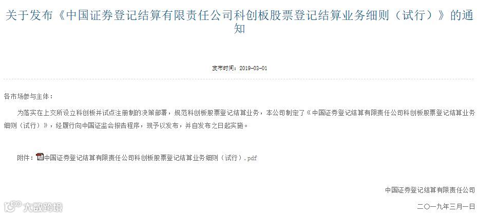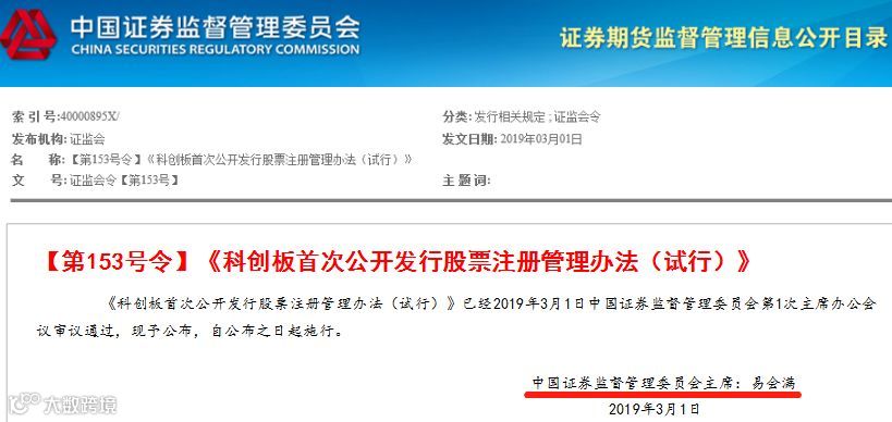 2019年3月1日,证监会发布了《科创板首次公开发行股票注册管理办法(试行)》(以下简称《注册管理办法》)和《科创板上市公司持续监管办法(试行)》(以下简称《持续监管办法》),自公布之日起实施。经证监会批准,上交所、中国结算相关业务规则随之发布。