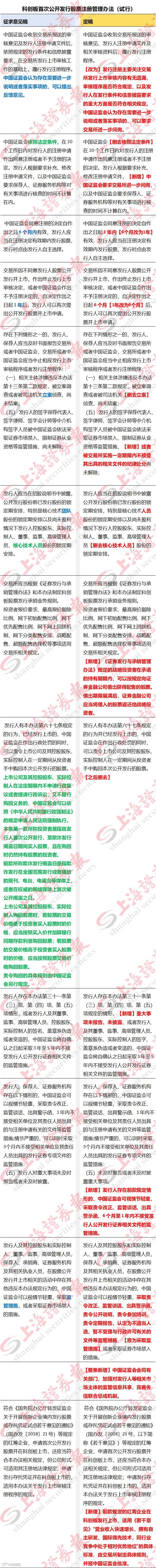 社会各界对设立科创板并试点注册制给予了高度关注,并提出了修改意见建议。证监会及有关单位对反馈意见逐条进行认真研究,充分吸收进一步明确注册要求和程序、优化减持制度、完善信息披露等合理意见,并相应修改完善了《注册管理办法》、《持续监管办法》等制度规则。