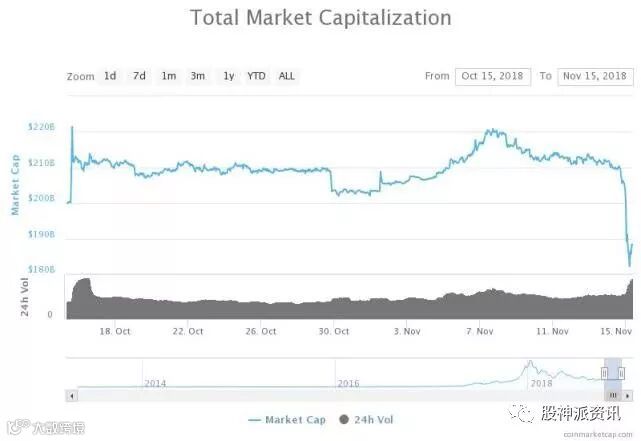 比特币现金将进行硬分叉协议升级。分叉前夕,Bitcoin ABC与Bitcoin SV两大阵营争锋相对,丝毫没有相互妥协的迹象,不禁引发市场担忧。11月14日下午起到15日凌晨,加密市场迎来全线跳水,加密货币总市值跌破2000亿美元的关口,一度跌至1822.28亿美元。