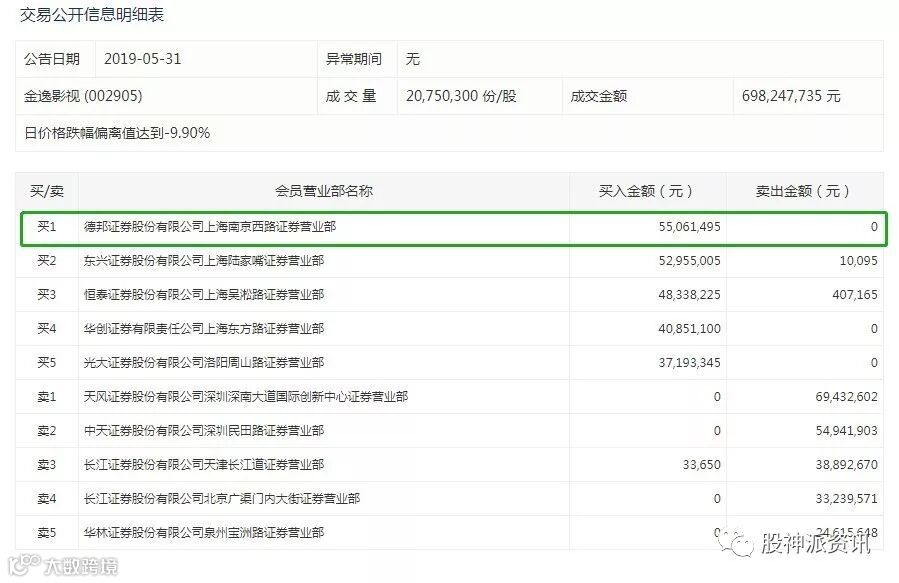 5月31日盘后数据显示,五大券商营业部杀入,净买入2.34亿元,净卖出总额2.21亿元。其中,昨日净卖出6656万的德邦证券股份有限公司上海南京西路证券营业部,今日净买入5506万元。