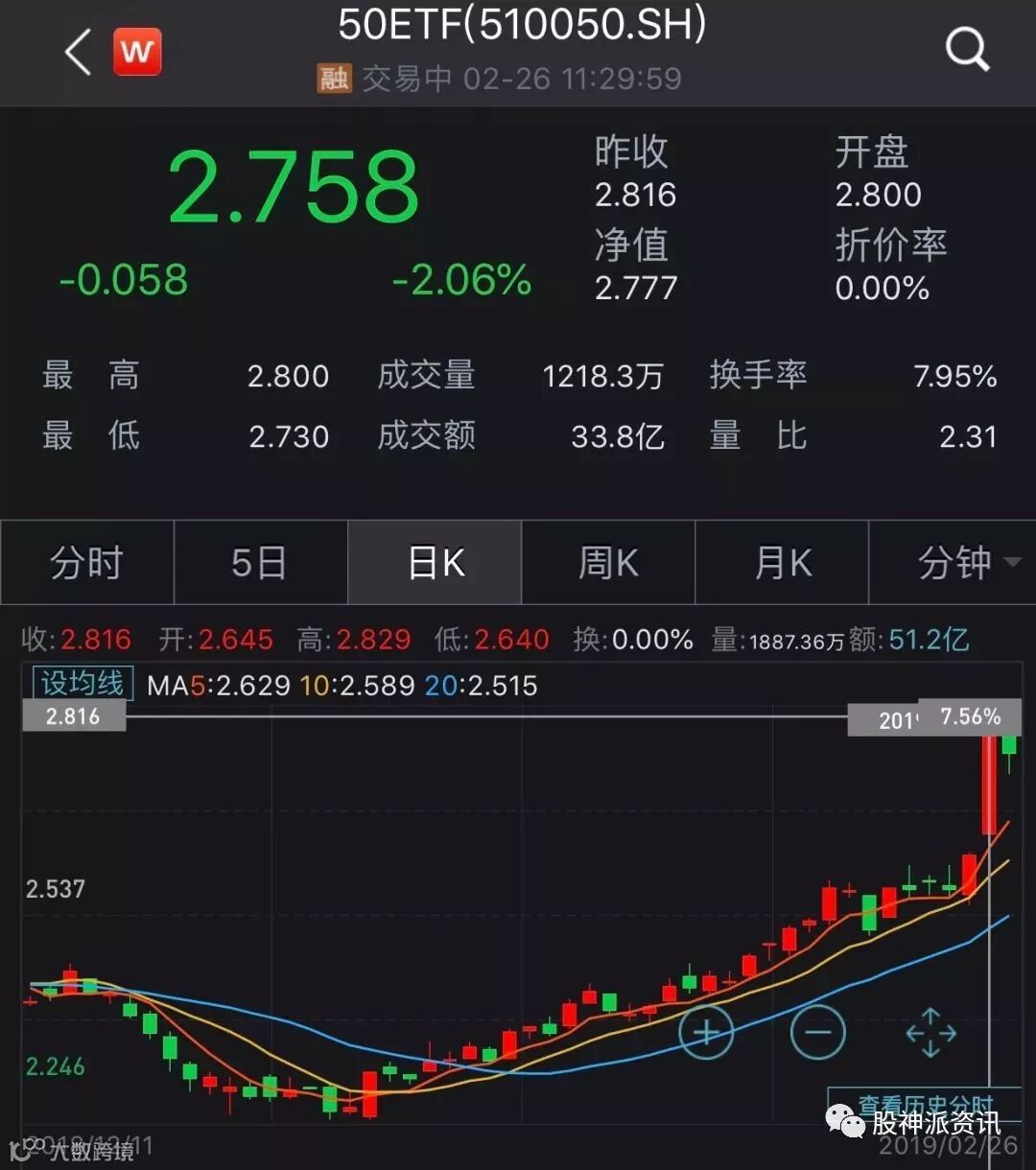 今年1月以来,50ETF现货价格至2月22日升至最高,但也仅2.618元/份,距离2.8元/份还有至少6.95%的差距。而在50ETF现货价格突破2.8元/份之前,该期权不存在行权必要,因此该合约的内在价值在昨天开盘时为0。
