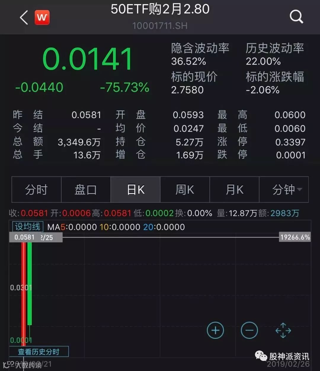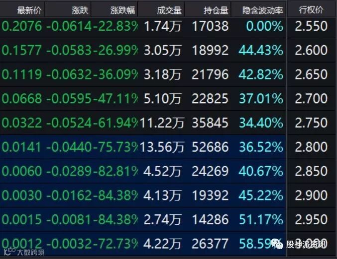 2月27日即本周三是2月合约的到期日,随着标的50ETF陷入震荡调整,该合约隐含波动率冲高后大幅回落,导致时间价值快速衰减,价格大跌。