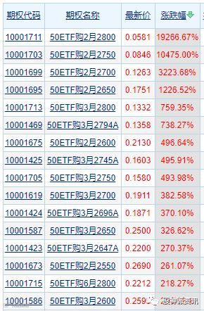 除此之外,昨日还有多只上证50ETF期权看涨合约集体大涨。其中,50ETF购2月2750大涨超100倍,50ETF购2月2700涨逾32倍,50ETF购2月2650涨逾12倍。另有不少50ETF的3月期权合约涨幅在数倍之间。