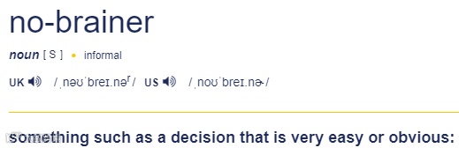 所以,“no-brainer”的意思,就是“无需用脑的事;容易的决定;理所当然;显而易见”。