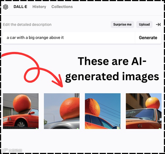 3)账号注册完成后,在对话框中输入描述然后点击Generate即可,使用方法与ChatGPT一样。例如,顶部有一个大橘子的汽车。