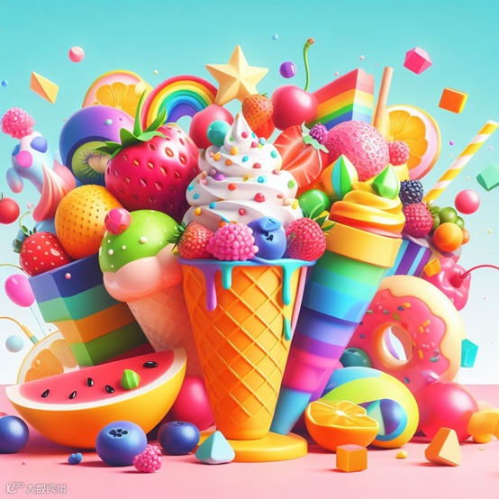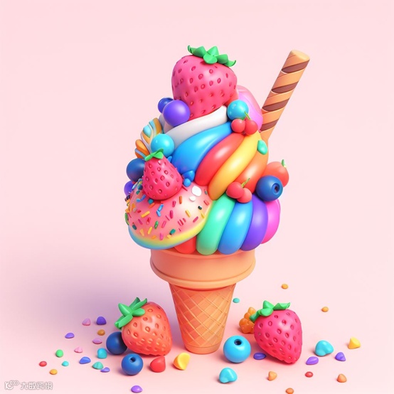例如,一个多彩的冰淇淋,水果很多,色彩斑斓,3D风格。
