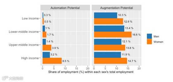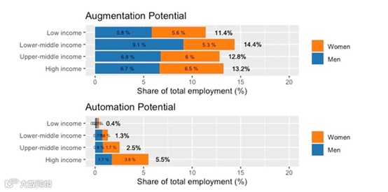 此外,女性受生成式AI自动化的影响是男性的2倍。主要是因为女性在文书类工作中的比例较高是其主要就业来源,特别是在中、高收入国家。
