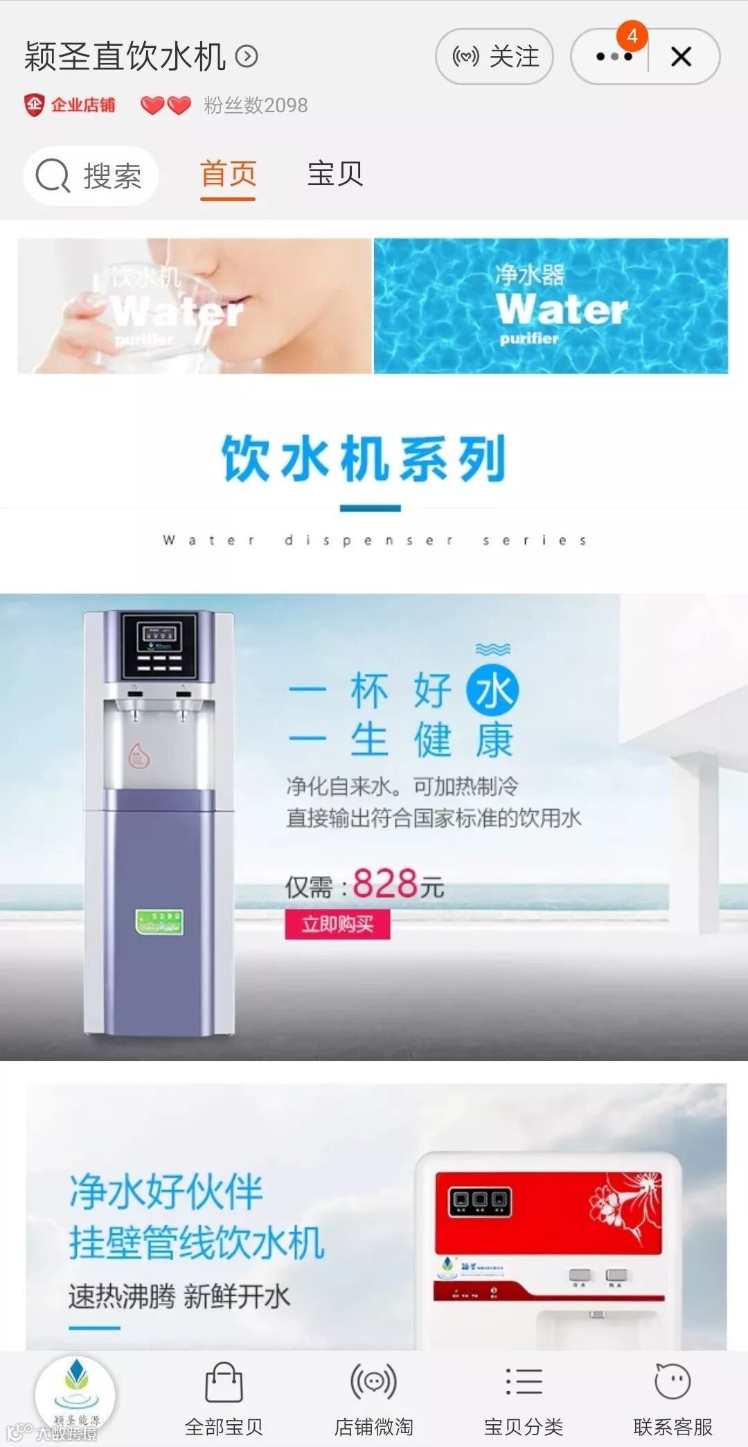 打开淘宝APP——“店铺”搜索栏输入“颖圣直饮水机”——打开店铺点击“关注”按钮——截图发送给淘宝客服——轻松领取“50元现金券”。