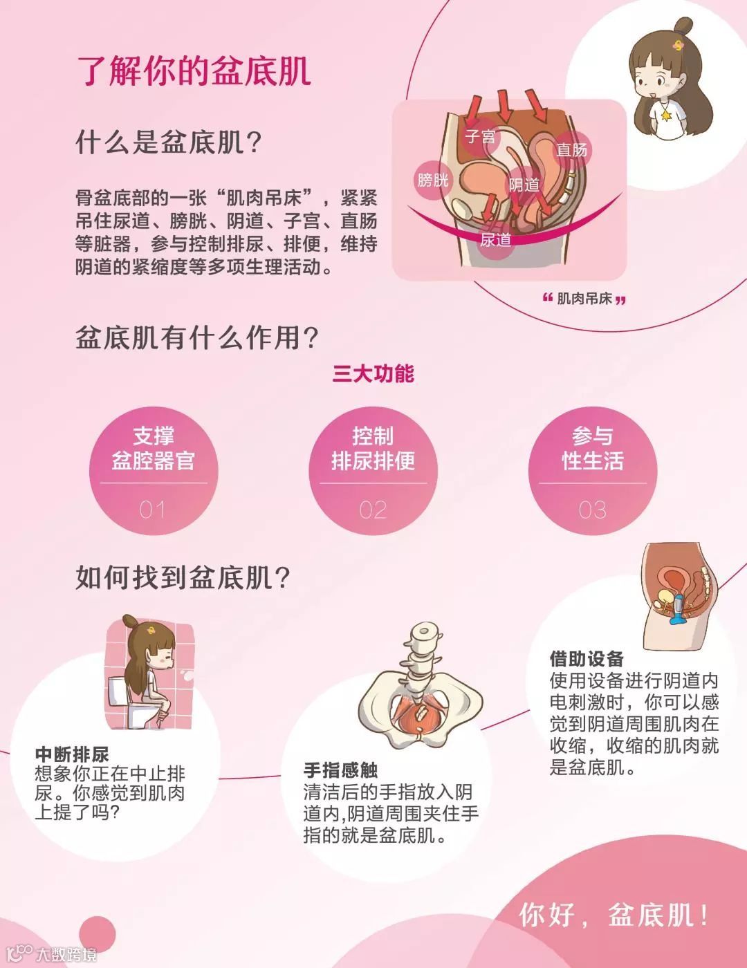 骨盆底部的一张“肌肉吊床”,紧紧吊住尿道、膀胱、阴道、子宫、直肠等脏器, 参与控制排尿、排便,维持阴道的紧缩度等多项生理活动。盆底肌三大功能:支撑盆腔器官、控制排尿排便、参与性生活。