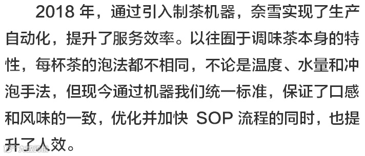 但是现阶段消费者要的是减少等待时间最快地拿到茶,来店的时候能保证每款她想吃的包都有,先解决用户最在意的事情,然后逐步通过产品、设备、培训、服务,做得更好。