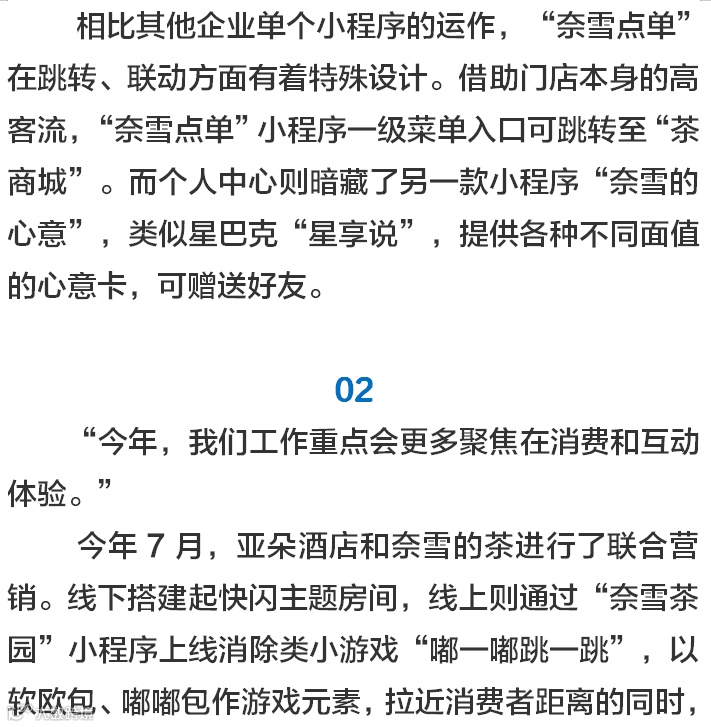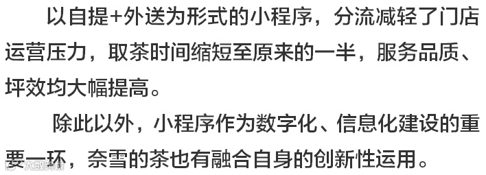 由茶饮行业整体来看,奈雪的茶、喜茶等品牌对小程序的应用,更多在业务赋能,起线上线下联结的作用。